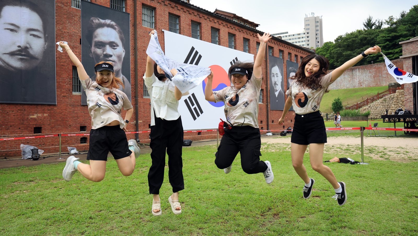 서대문형무소역사관을 찾은 시민들이 대형 태극기와 독립운동가들의 얼굴이 담긴 현수막 앞에서 ‘대한독립만세’를 외치고 있다. 2025.8.15. 뉴스1
