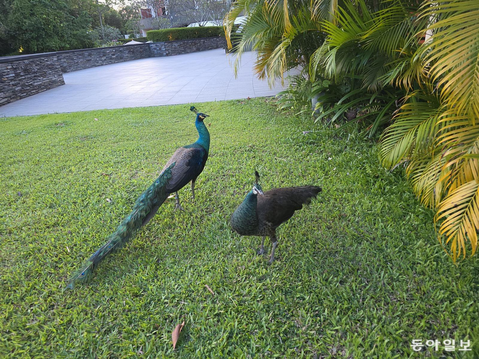 센토사섬은 싱가포르에서 자연환경이 가장 잘 보존돼 있는 섬이다. 여행객들이 가장 즐거워하는 것은 예상치 못한 ‘공작과의 만남’이다. 공작은 리조트를 당당하게 활보하고 해변 풀숲에서 우아하게 산책한다. 세계 어떤 곳에서도 이렇게 많은 공작을 만나기란 어렵다(사진).