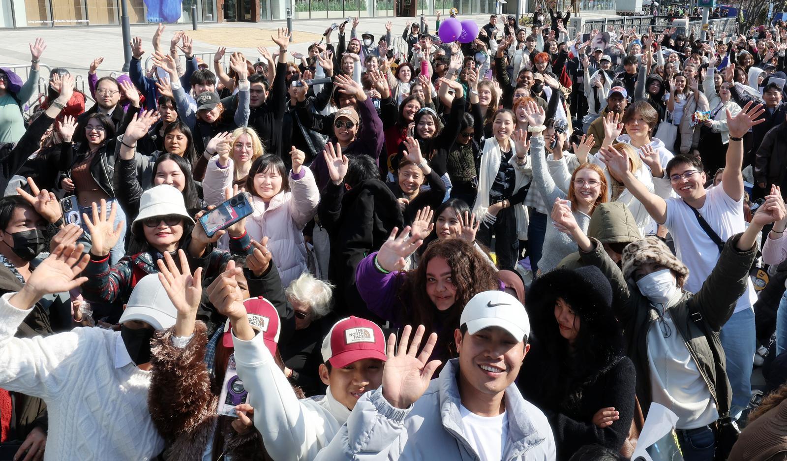 방탄소년단(BTS) 컴백 공연일인 21일 오전 서울 종로구 광화문광장에서 팬들이 공연 시작을 기다리며 취재진을 향해 환호하고 있다. 뉴스1