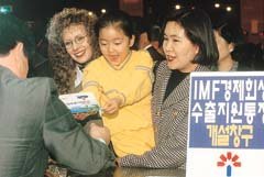 한일은행이 1일 서울 명동본점에서 개최한 ‘IMF 경제회생 수출지원통장’발매식에 외국인 여성과 어린이 등이 찾아와 새로 개설한