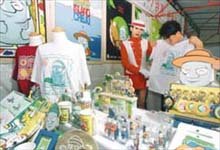 전국체전이 열리고 있는 제주에서는 돌하루방 캐릭터상품이 인기를 끌고 있다. 제주 애향체육관에 마련된 특산물매장에서 관광객이 하루방이 그려진 옷을 고르고 있다.