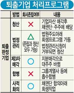 법정관리 신청 자체를 법원이 기각해 청산절차에 들어갈 수도 있다. 지난달 9일 미주실업(워크아웃 중단업체)의 법정관리 신청을 법원이 기각했다. 법원이 채권단조차 워크아웃을 통한 회생 가능성이 없다고 판단한 기업을 받아들일 이유가 없다.