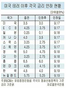 ▽국제 공조에 동참〓테러 후 전 세계는 금융시장 안정을 위해 거의 비슷한 시간에 금리를 대폭 내리고 있다. 17일밤(한국시간) 미국 연방준비제도이사회(FRB)가 금리를 0.5%포인트 내린 것을 시작으로 유럽중앙은행(ECB) 캐나다 스웨덴 대만 홍콩 영국 일본 등 12개국이 금리를 내렸다. 때문에 이번 금리인하는 금융시장 안정을 위한 각국의 노력에 협조한다는 측면도 있다. 이 같은 국제공조는 이례적인 일. 85년 플라자협정 때는 선진5개국만의 일이었으며 동남아시아 통화위기와 러시아 위기로 국제금융시장이 위기에 빠졌을 98년 8월에도 선진7개국이 금리를 내리기까지는 무려 3개월이나 걸렸다.