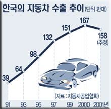 자동차공업협회 김광영(金光英) 부회장은 “올해 자동차 수출물량이 감소한 것은 전반적인 세계경기 침체로 세계 자동차시장의 수요가 살아나지 않는 데다 미국 테러사태로 하반기 미국 시장이 침체했기 때문”이라고 분석했다. 특히 유럽 중남미 아시아지역으로의 수출대수는 올해 최대 50%나 격감했다.