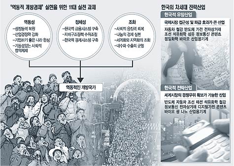 시장의 힘이 커진 현실을 받아들여 민간 부문의 자율 기능을 중시하는 방향으로 경제주체의 역할을 재조정하는 일도 빼놓을 수 없다. 또 국제사회에서 고립되지 않도록 세계화에 동참하고 세계경제의 지역화에 대응해 중국 일본 등과의 동북아 경제협력을 주도할 책무도 갖고 있다.