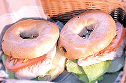 ▽베이글 치킨 샌드위치〓식빵 대신 베이글이 샌드위치 빵으로 인기다. 빵 반죽을 우유 달걀 등으로 부드럽게 하지 않고 밀가루 위주로 만들어 쫄깃하고 담백한 맛이 난다.