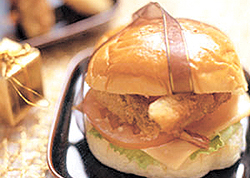 ▽새우 튀김 햄버거〓통 새우를 그대로 튀겨 햄버거 속으로 사용하면 시중의 새우버거보다 진한 새우맛을 즐길 수 있다.