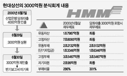 산업은행은 2일 “현대상선이 2000년 6월7일 인출한 당좌대출 4000억원 가운데 3000억원을 만기(30일) 하루 전인 29일 갚았다가 30일에 다시 대출해갔다”며 “반기보고서에 이 부분이 빠졌다”고 밝혔다.