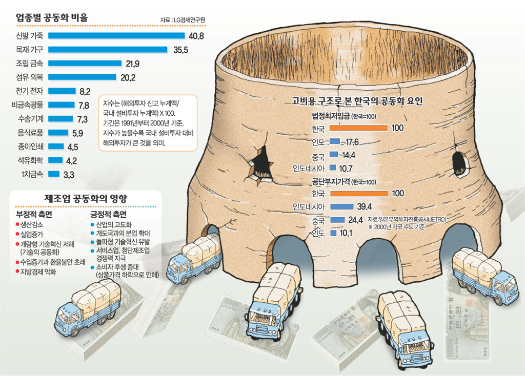 신발 섬유 등 일부 업종에선 이미 공동화가 진행되고 있다. LG경제연구원은 1인당 국내총생산(GDP)이 2만달러 수준에 도달하는 2007년에 공동화가 본격화할 것으로 내다봤다.