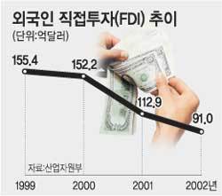 산업자원부가 7일 발표한 ‘2002년 외국인 투자실적(잠정)’에 따르면 지난해 외국인들의 대한(對韓) 직접투자는 91억100만달러(신고 기준)로 1년 전보다 19.4% 감소했다. 이는 산자부가 지난해 목표로 잡았던 130억∼150억달러보다 훨씬 적으며 2000년 이후 3년째 감소세를 보였다.