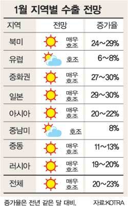 대한무역투자진흥공사(KOTRA)는 해외 바이어 517개사와 주재상사 300개사를 대상으로 1월 중 해외시장 수요전망을 조사한 결과 세계경제의 회복 조짐으로 수입 수요가 늘면서 한국상품 수출이 평균 20∼23% 증가할 것으로 예상된다고 7일 밝혔다.