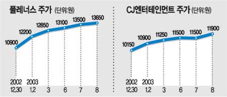 인수설에 대한 기대감으로 CJ엔터테인먼트 주가는 이날 1만1900원에 마감해 전날보다 3.48% 올랐다. 플레너스 주가도 5일 연속 11.89% 올라 1만3650원에 마감했다.