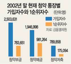 일정액을 한꺼번에 예치하고 기간이 지나면 1순위자가 되는 청약예금 가입자는 194만6998명. 청약부금처럼 적금식으로 넣되 국민주택기금 지원을 받는 전용면적 25.7평 이하 아파트에 청약할 수 있는 청약저축 가입자는 78만9858명이었다.