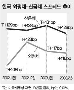 9일 금융계에 따르면 1998년 정부가 발행한 10년짜리 외평채는 지난 주말 미 재무성증권 수익금리(T) 플러스 117bp(1bp는 0.01%)의 가산금리를 보였다.