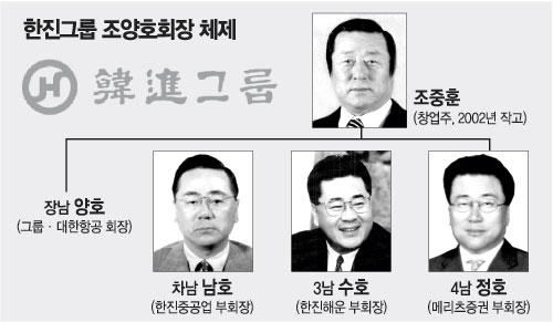 장남인 조 회장이 그룹 회장에 취임함에 따라 차남인 조남호(趙南鎬) 한진중공업 부회장, 3남인 조수호(趙秀鎬) 한진해운 부회장, 4남인 조정호(趙正鎬) 메리츠증권 부회장도 각각 회장에 취임할 예정이다.