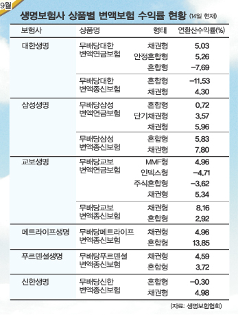 ▽수익률 관리 요령〓변액보험은 △채권형 △혼합형 △MMF형 △단기채권형 △안정혼합형 등으로 나뉘지만 혼합형과 채권형이 대부분을 차지한다.