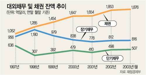 한국의 단기외채는 2001년 말 410억달러에서 2002년 말 498억달러로 늘어난 데 이어 올해 1월 말에는 507억달러로 증가했다.