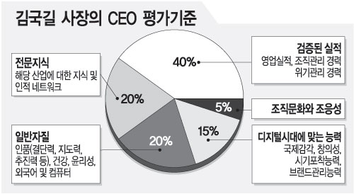김 사장이 제시하는 CEO 채용 평가표에 따르면 가장 비중이 높은 항목이 검증된 실적(40%)이다. 이는 영업실적, 조직관리능력, 위기관리능력 등 과거의 경험과 경력을 말한다. 그 다음은 전문지식(20%)이다. 해당 산업에 대해 얼마나 깊은 지식을 지녔고 얼마나 탄탄한 인적 네트워크를 보유하고 있는지 여부다. 다음은 일반자질(20%)로 결단력 지도력 추진력 등의 인품과 건강, 윤리성, 외국어 및 컴퓨터 활용 능력 등이다. 국제 감각, 창의성, 시기 포착 능력, 브랜드 관리 능력 등은 디지털 시대에 맞는 능력(15%)으로 분류된다. 마지막으로 조직문화와의 조화 가능성(5%)이다. 이 평가표에 따르면 윤리성은 일반자질의 한 요소일 뿐이다.