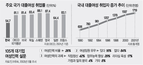 삼성경제연구소 강우란(姜又蘭) 수석연구원은 “그동안 성차별이 문제가 됐다면 앞으로는 여성인력 저(低)활용 문제가 이슈가 될 것”이라며 “여성인력을 얼마나 잘 활용하느냐에 따라 기업의 성패, 나아가 국가의 미래가 갈릴 것”이라고 말했다.