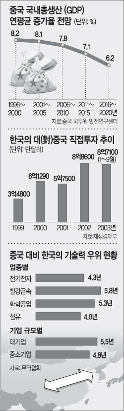 한국의 대(對)중국 투자도 가파르게 늘고 있는 추세다. 1999년 3억4800만달러에서 2002년에는 8억8600만달러로 3년 만에 2.5배로 늘었다.