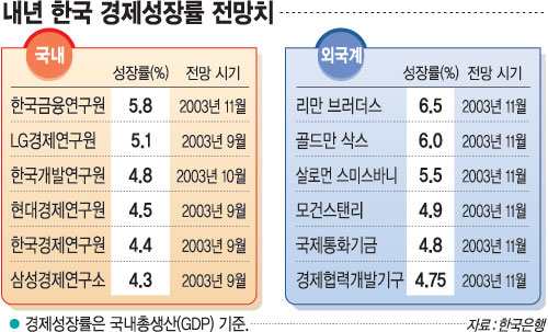 미국계 투자은행인 리만브러더스는 6.5%로 가장 높은 전망치를 내놓았으며 골드만삭스(6.0%) 살로먼스미스바니(5.5%) 도이체방크(5.0%) 등은 한국이 올해 2∼3%대의 저성장에서 고성장으로 돌아설 것으로 전망했다. 국제통화기금(IMF)과 경제협력개발기구(OECD) 등 한국 정부에 자료를 의존하는 국제기구의 전망치는 4.8%와 4.75%로 비교적 낮았다.
