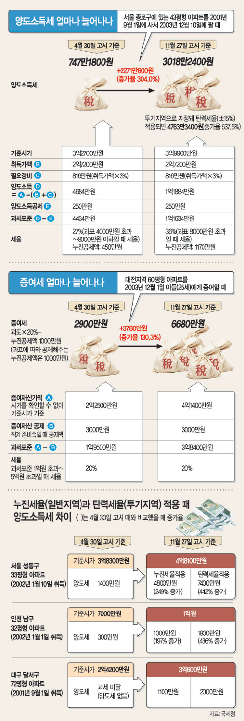 실제로 올 5월 29일 투기지역으로 편입된 서울 송파구 문정동 훼밀리아파트 68평형(2002년 1월 10일 취득 후 2003년 12월 1일 양도 기준)은 올 4월 30일 고시된 기준시가로 하면 양도세가 419만400원이다.