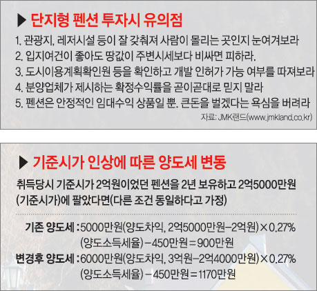 이와 함께 올해부터 펜션의 용도가 가족호텔로 분류돼 건물기준시가가 20% 올라 양도소득세 등 세금 부담도 늘어날 전망이다.