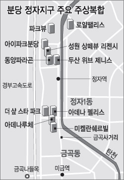 정자동 탄천 서쪽에 6월 들어설 주상복합 파크뷰는 현재 40평형 이상대의 경우 초기 분양가보다 웃돈을 3억∼5억원 정도 더 줘야 살 수 있다. 48평형은 8억7000만원, 63평형은 10억4900만원대까지 가격이 치솟았다. 정자동 엘리트부동산 강민호 부장은 “현재 매매가는 몇 개월 전에 비해 크게 오르진 않았지만, 본격적인 입주가 시작되면 다시 움직일 것으로 예상한다”고 말했다.