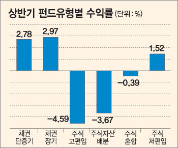 반면 주식형은 주식 투자비중이 30% 미만인 ‘주식 저(低)편입형’을 제외하곤 대부분 마이너스였다. 특히 주식투자비중이 60% 이상인 ‘주식 고(高)편입형’의 상반기 수익률은 ―4.59%로 종합주가지수의 수익률(―3.07%)보다 나빴다.