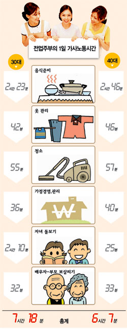 통계청이 5년마다 작성하는 ‘1999년 국민생활시간조사 보고서’에 따르면 배우자가 있는 한국 주부의 하루 가사노동시간은 6시간35분이었다. 자녀 돌보기로 인해 20대와 30대의 가사노동시간이 가장 길었고 40대에서는 음식준비시간 사용이 두드러졌다. 60대도 하루 평균 5시간1분을 가사노동에 쓰고 있었다.