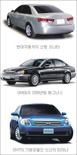 르노삼성자동차도 이에 뒤질세라 내년 초 내놓을 예정이었던 대형 승용차인 ‘SM7’(프로젝트명 EX)을 연말에 선보일 계획이다. SM7은 닛산의 ‘티아나’를 기본 모델로 한 배기량 3500cc급 차량이다.