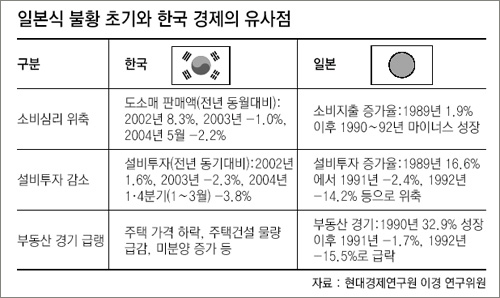 일본식 장기불황 초기의 전형적 특징인 △무역수지 흑자 속에서 소비와 투자 심리 위축 △부동산 투기 억제책으로 건설경기 급랭 △소비 불황의 장기화 조짐과 제조업 공동화 현상 △저금리 속 경기 침체와 거시경제 정책의 무력성 등이 나타나고 있다는 것.