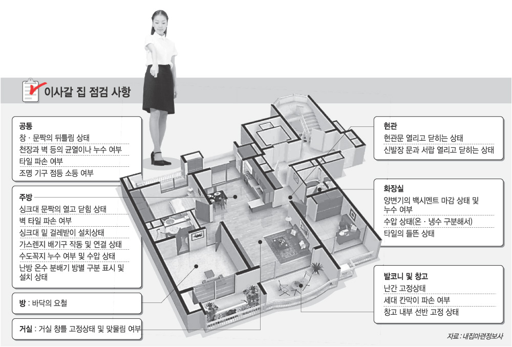 각 방의 문이나 창문은 모두 여닫아 보아 뒤틀린 곳이 없는지 확인한다. 욕실에 있는 타일은 들뜬 곳이 없는지 두드려 본다.
