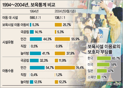 ▽“보낼 곳이 마땅찮다”=여성부가 9월 발표한 ‘보육통계’ 자료를 분석한 결과 보육시설 수는 1994년 590명당 1곳에서 2004년 138명당 1개꼴로 급격히 성장했다. 그러나 문제는 질적 성장.
