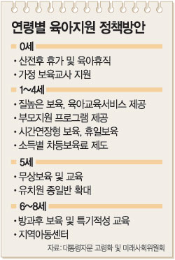 ▽사회가 함께 키워야=여성부는 내년부터 현재 시설별로 지원되고 있는 보육지원금을 가구별 소득수준에 맞춰 개별 지원하는 것을 골자로 하는 영유아 보육 관련법안을 국회에 상정해 놓고 있다.