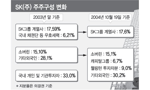 ▽외국인 주주, 누구 손을 들까=가장 중요한 지분을 놓고 볼 때 일단 SK그룹이 불리하다. 외국인 지분은 지난해 말 43%에서 61%로 높아졌고 특히 미국의 웰링턴투자자문과 캐피털그룹이 새롭게 5% 이상 주요 주주로 등장했다.