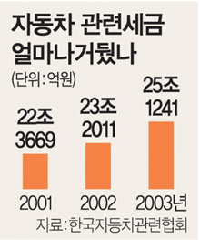 1일 재정경제부와 한국자동차공업협회에 따르면 작년 주행세와 교통세 등을 포함한 자동차 관련 세수는 25조1241억원으로 전년(23조2011억원)보다 8.3% 증가했다.