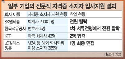 또 국가자격증이라도 취업 현장에서 요구하는 업무 능력과 무관한 경우가 많다는 것이 전문가들의 지적이다. SK텔레콤 측은 “회계사 자격증을 소지한 지원자들은 회계 또는 자금 관련 부서에서 근무해야 하는데 이 부문의 채용인원이 너무 적었다”고 설명했다.