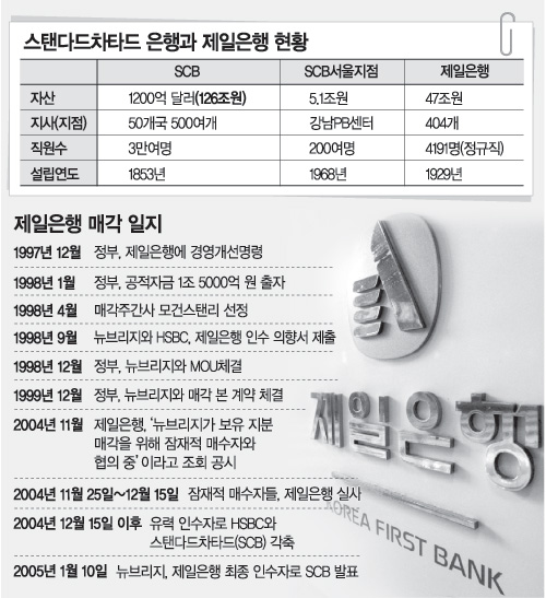SCB는 한미은행의 2대 주주(지분 9.8%)라는 유리한 위치에서 1대 주주인 미국계 칼라일펀드와 협상했지만 씨티그룹에 고배를 마셨다. 이후 SCB는 제일은행에 눈길을 돌리게 된 것.
