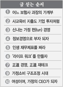 기업 투명성을 평가하는 잣대인 공시(公示), 회계, 지배구조 등과 관련한 기준을 가정경제에 적용해야 한다는 것. 전문가들은 이를 위해 △가족 구성원이 서로의 정보를 공유하는지(공시) △가계부를 제때 정확히 결산하는지(회계) △대화를 통해 의사결정을 하는지(지배구조) 등을 점검해야 한다고 조언했다.