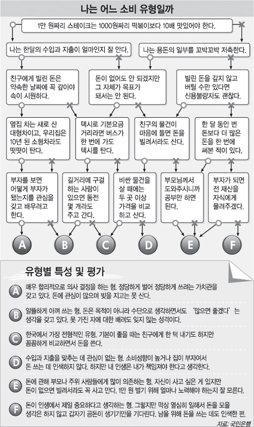 소비 유형은 6개로 분류했다. A형이나 B형으로 나오면 돈과 소비에 대한 바람직한 가치관을 갖고 있는 만큼 금융 상식만 있으면 합리적인 소비 생활을 할 수 있는 사람으로 평가된다.