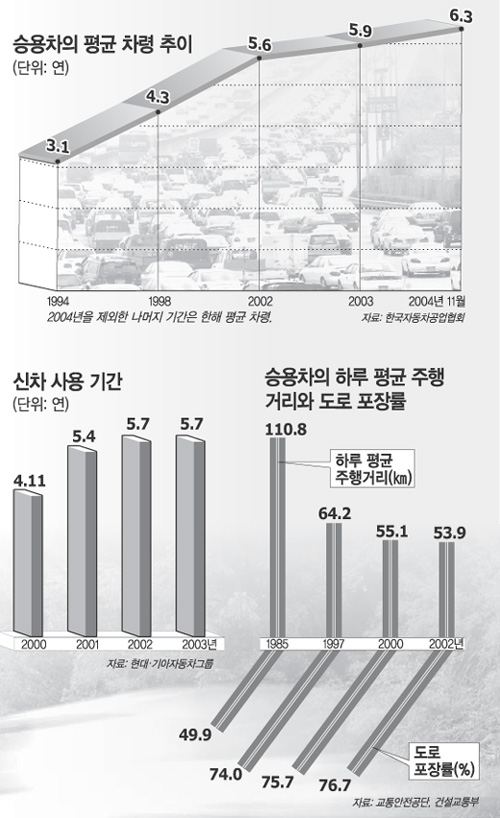 도로가 잘 닦인 것도 차량의 내구성을 높여주는 요인. 건설교통부 집계에 따르면 1985년 도로 포장률은 49.9%에 불과했지만 2002년에는 76.7%에 이른다. 경기 부진으로 차가 덜 팔리고 있는 점도 차령 상승의 한 이유다. 작년 국내 자동차 판매량(수출 제외)은 109만여 대로 2003년 131만여 대보다 17% 줄었다. 내수 판매는 2002년 160여 만 대를 기록한 뒤 2년 연속 감소 추세다.