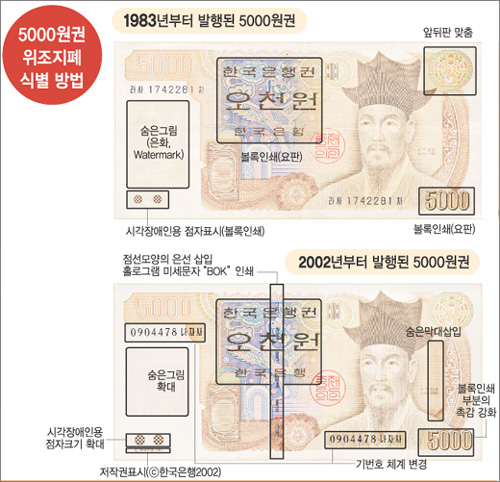 특히 1983∼2003년 발행된 ‘다 5000원권’은 지폐 중간 부분에 있는 ‘부분노출 은선’이 없어 위조범의 대량 위조 타깃이 되고 있다.