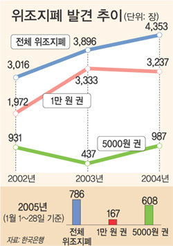 한은 발권국 한민(韓旼) 조사역은 “김 씨가 갖고 있던 5000원권의 일련번호를 확인한 결과 최근 발견된 5000원권 위폐와 동일한 것이었다”고 말했다. ▽‘혹시 내 지갑에 든 5000원짜리도?’=31일 한은에 따르면 지난해 발견된 위폐는 1만 원, 5000원, 1000원권 등 모두 4353장으로 전년에 비해 11.7% 증가했다.