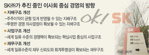 ▽이사회 중심 경영 가속화할 듯=최 회장은 이사회에서 “재신임을 받았으니까 그룹의 지배구조와 재무구조, 사업구조를 개선하는 데 박차를 가하겠다”고 말했다.
