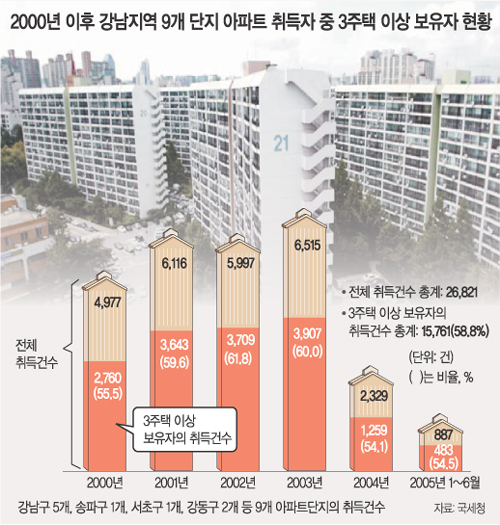 2000년 이후 올해 6월까지 서울 강남 서초 송파 강동구 등 강남지역에서 값이 많이 오른 9개 아파트단지의 거래를 분석한 결과 3주택 이상 보유자가 전체 주택 취득 건수의 절반 이상(58.8%)을 차지했다.