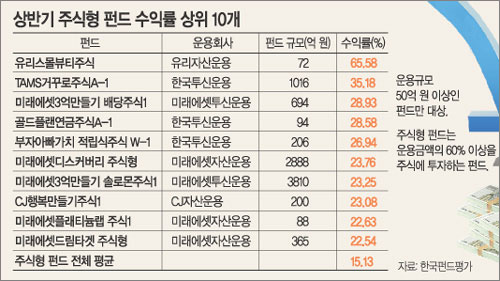 운용금액의 60% 이상을 주식에 투자하고 나머지를 채권 등에 투자하는 주식형 펀드의 상반기 평균 수익률은 15.31%였다. 연간으로 따지면 수익률이 30%를 넘는 셈.