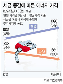 정부가 추진하고 있는 에너지세제개편안에 따라 현재 100 대 70 대 53인 휘발유, 경유, LPG의 상대가격 비율이 8일부터 100 대 75 대 50으로 조정되기 때문이다.
