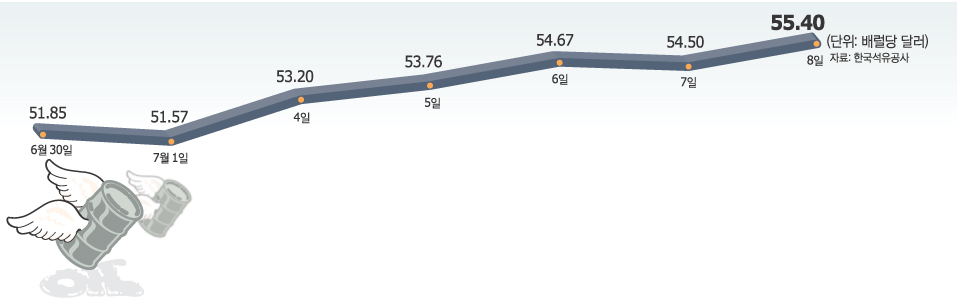 10일 한국석유공사에 따르면 8일 중동 현지에서 거래된 두바이유 가격은 배럴당 55.40달러로 전날보다 0.90달러 오르면서 사상 최고를 기록했다.