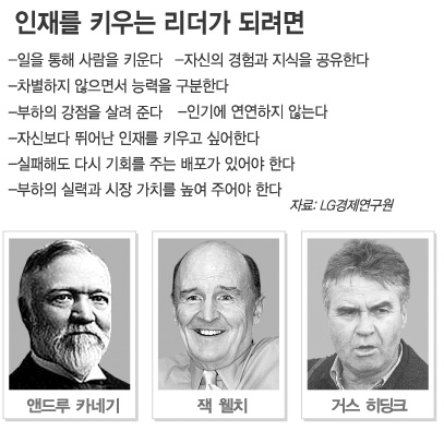 파산 위기의 크라이슬러를 구해낸 리 아이어코카는 재임 시절 스타 경영자로 우뚝 섰지만 인재를 육성하지 않아 결국 그가 퇴임한 뒤 회사는 다임러벤츠에 인수되고 말았다. 반면 ‘강철왕’ 앤드루 카네기, 킴벌리 클라크의 다윈 스미스, 질레트의 콜먼 모클러 등은 자신보다 나은 부하를 키워낸 CEO들.